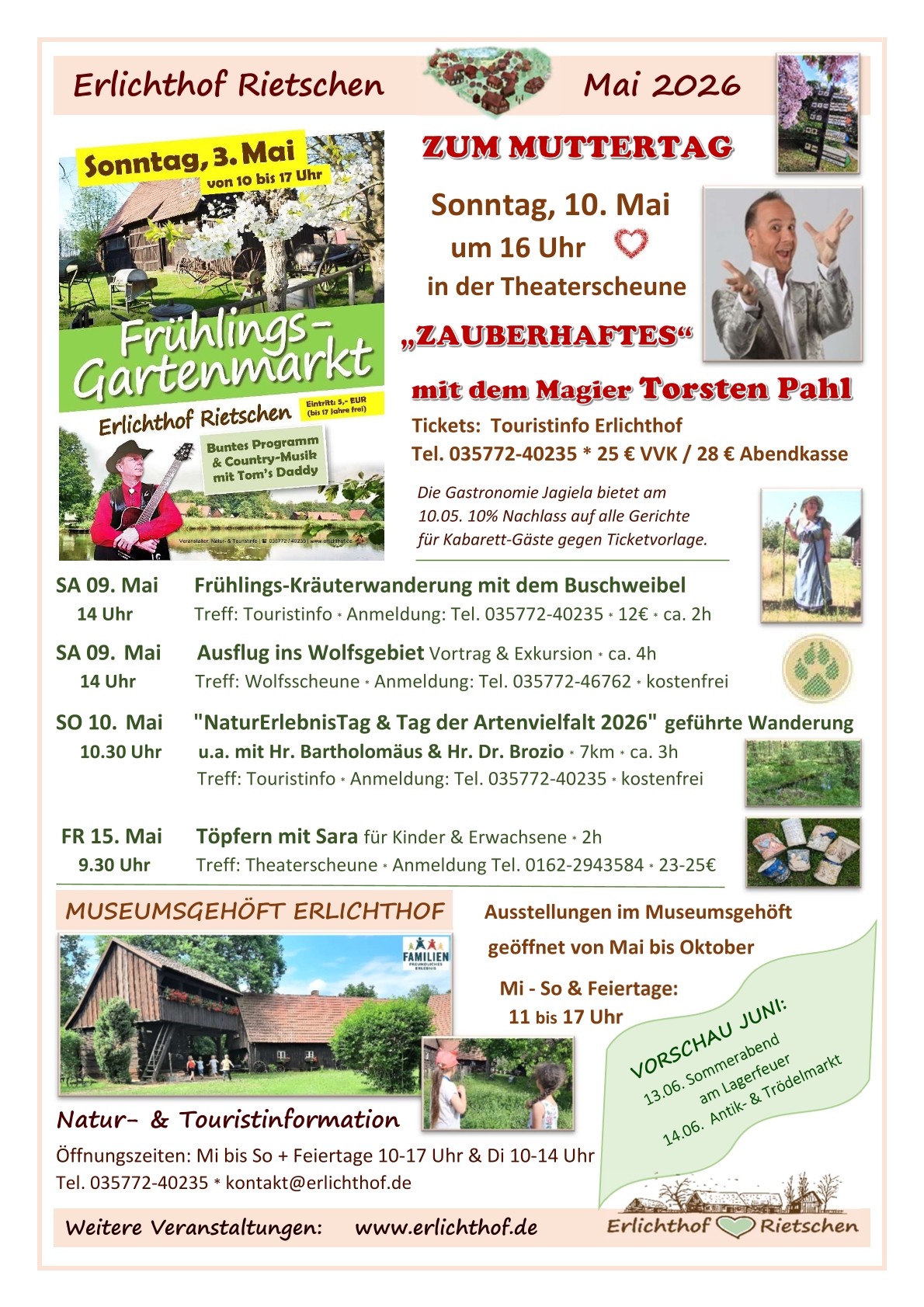 - Naturerlebnisse, Führungen, Kabarett-Veranstaltungen & Projekte für Klein & Groß oder Gruppen gerne anfragen: Tel. 035772-40235 oder kontakt@erlichthof.de